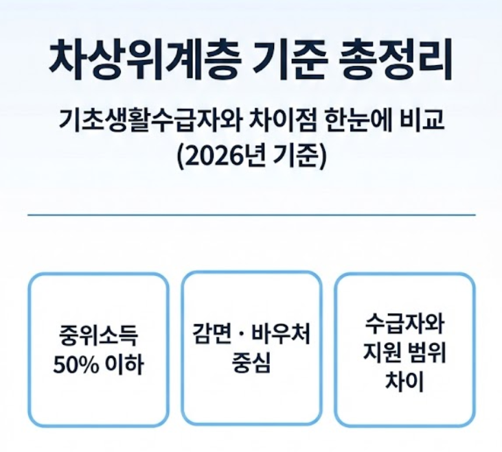 기초생활수급자와 함께 자주 언급되는 제도가 바로 ‘차상위계층’입니다. 두 제도 모두 저소득층을 지원한다는 공통점이 있지만, 선정 기준과 지원 내용에는 차이가 있습니다. 이번 글에서는 2026년 기준 차상위계층 기준과 기초생활수급자와의 차이점을 쉽게 정리해드립니다.